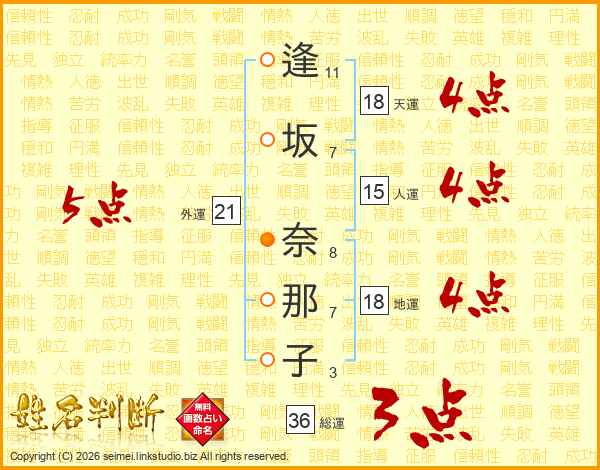 逢(11画)坂(7画) 奈(8画)那(7画)子(3画)