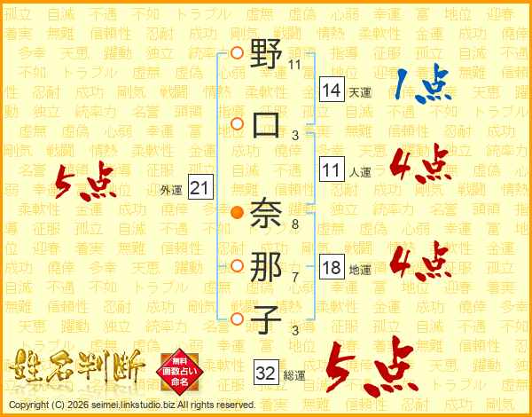 野口奈那子さんの総運は32画の5点!