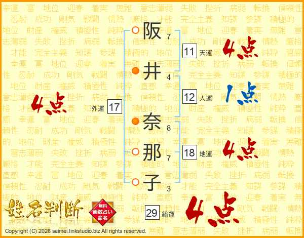 阪井奈那子さんの天運は11画の4点!