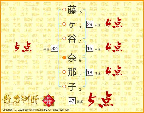 藤ヶ谷奈那子さんの総運は47画の5点!