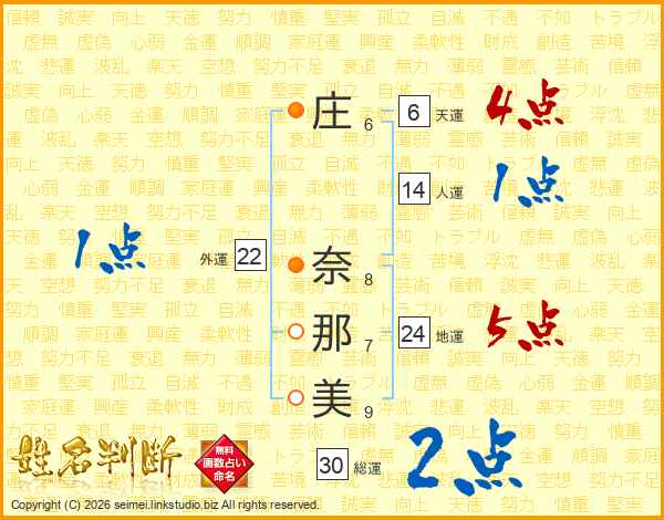 生活面を象徴する運勢です。外部から受ける影響力を表し、結婚運、家庭運や職場、環境への順応性を表します。総運から人運を引いた画数。姓や名が1文字の場合を除く。