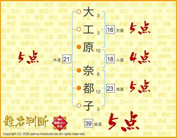 大(3画)工(3画)原(10画) 奈(8画)都(12画)子(3画)