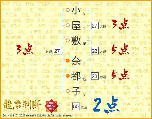 小(3画)屋(9画)敷(15画) 奈(8画)都(12画)子(3画)
