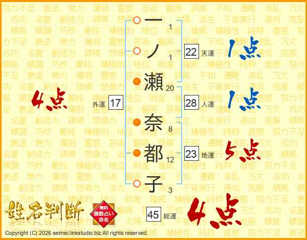 一(1画)ノ(1画)瀬(20画) 奈(8画)都(12画)子(3画)