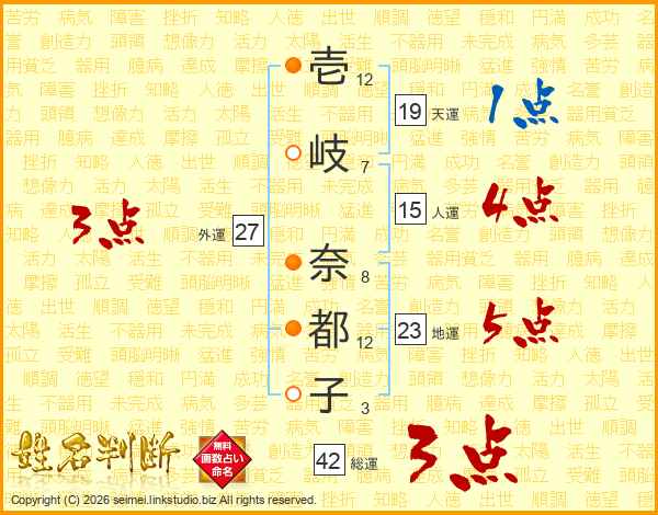 壱(12画)岐(7画) 奈(8画)都(12画)子(3画)