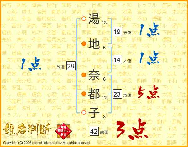 湯(13画)地(6画) 奈(8画)都(12画)子(3画)