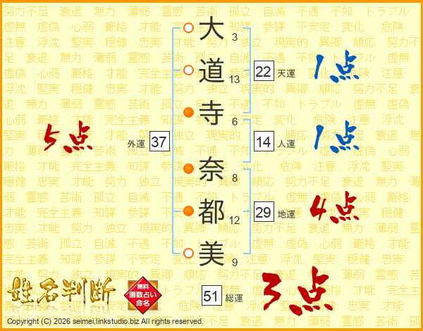 大(3画)道(13画)寺(6画) 奈(8画)都(12画)美(9画)