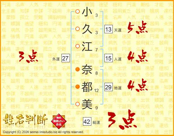 小(3画)久(3画)江(7画) 奈(8画)都(12画)美(9画)