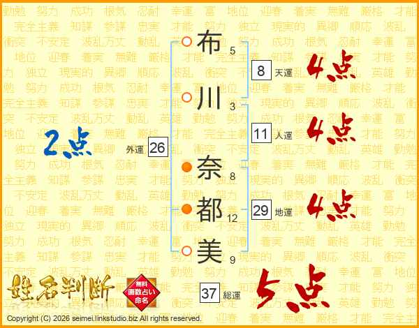 布(5画)川(3画) 奈(8画)都(12画)美(9画)
