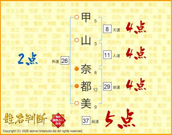 甲(5画)山(3画) 奈(8画)都(12画)美(9画)