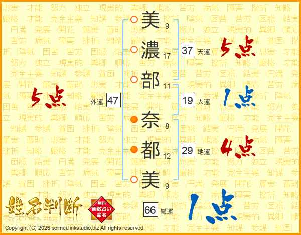 美(9画)濃(17画)部(11画) 奈(8画)都(12画)美(9画)