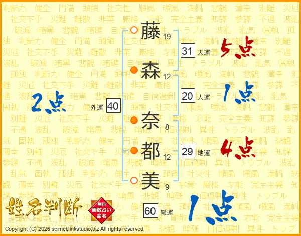 藤(19画)森(12画) 奈(8画)都(12画)美(9画)
