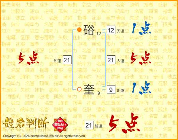 硲奎さんの総運は21画の5点!