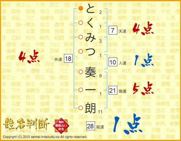 あなたの人生を表す1番重要な運勢です。生涯を通じて影響する総合運となり、主に50歳以降の晩年期に影響を及ぼします。苗字と名前の合計画数。