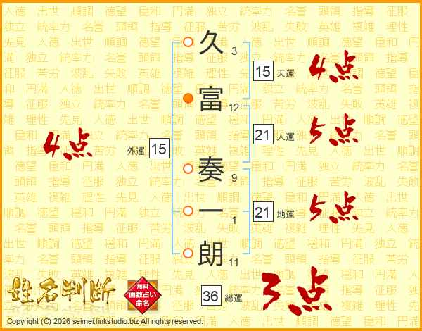 久(3画)富(12画) 奏(9画)一(1画)朗(11画)