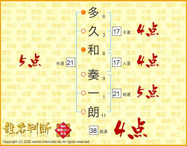 多久和奏一朗さんの総運は38画の4点!