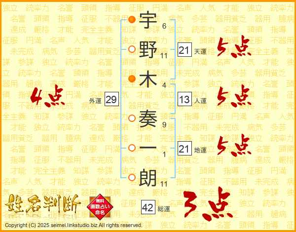 宇(6画)野(11画)木(4画) 奏(9画)一(1画)朗(11画)