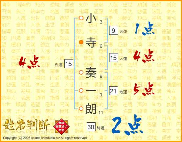 小(3画)寺(6画) 奏(9画)一(1画)朗(11画)