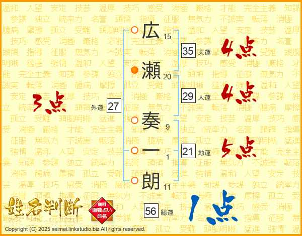 広(15画)瀬(20画) 奏(9画)一(1画)朗(11画)
