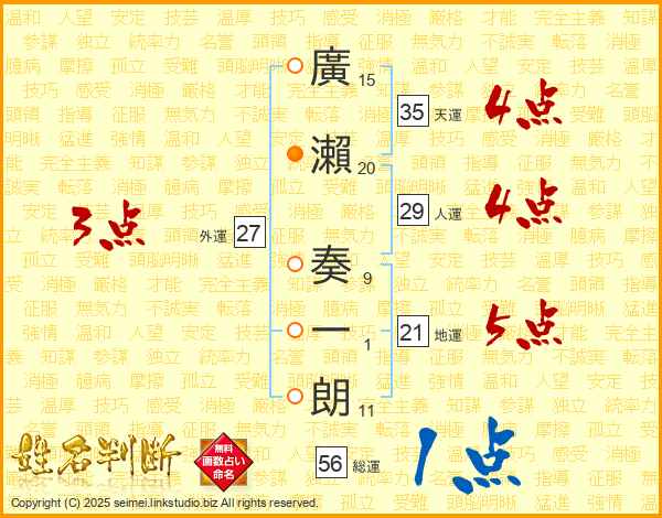 廣(15画)瀨(20画) 奏(9画)一(1画)朗(11画)
