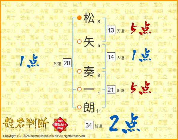 生活面を象徴する運勢です。外部から受ける影響力を表し、結婚運、家庭運や職場、環境への順応性を表します。総運から人運を引いた画数。姓や名が1文字の場合を除く。