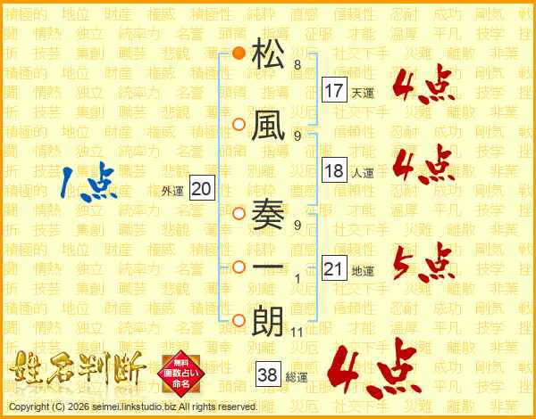 松(8画)風(9画) 奏(9画)一(1画)朗(11画)