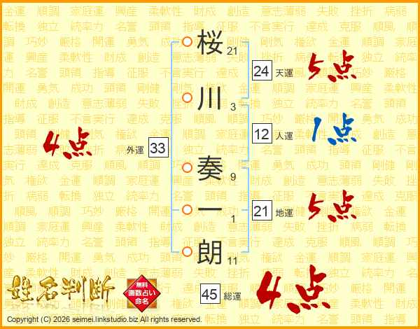 桜(21画)川(3画) 奏(9画)一(1画)朗(11画)