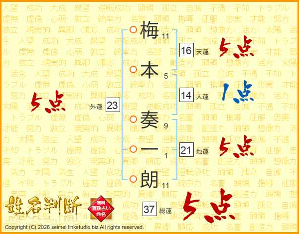 梅(11画)本(5画) 奏(9画)一(1画)朗(11画)
