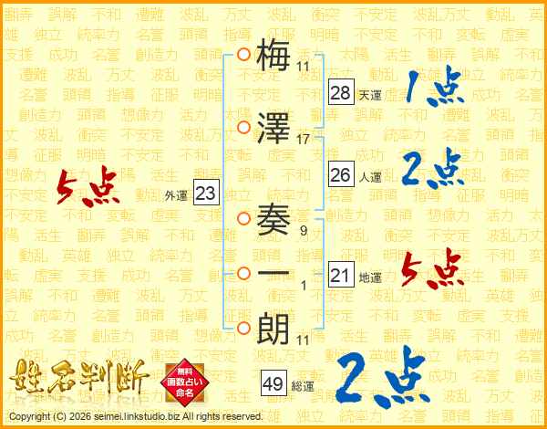 梅(11画)澤(17画) 奏(9画)一(1画)朗(11画)