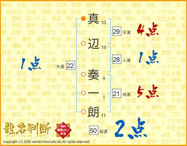 真(10画)辺(19画) 奏(9画)一(1画)朗(11画)