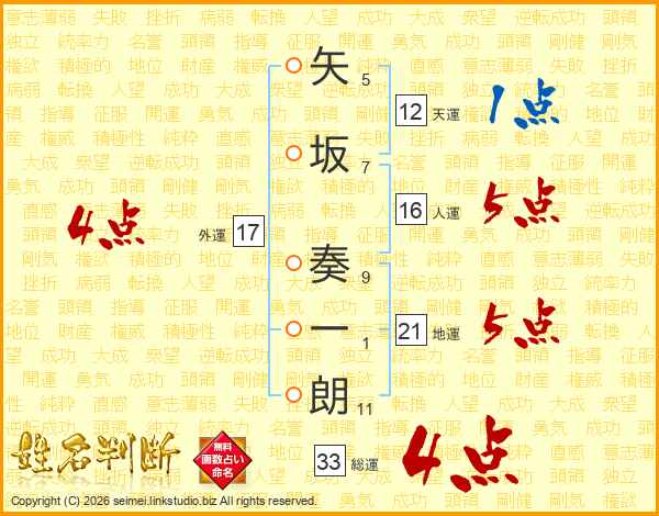 矢坂奏一朗さんの総運は33画の4点!