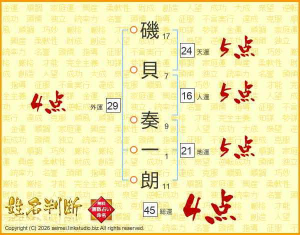 磯(17画)貝(7画) 奏(9画)一(1画)朗(11画)