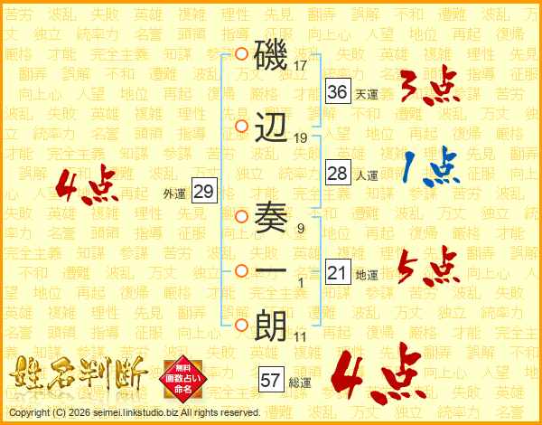 磯辺奏一朗さんの総運は57画の4点!