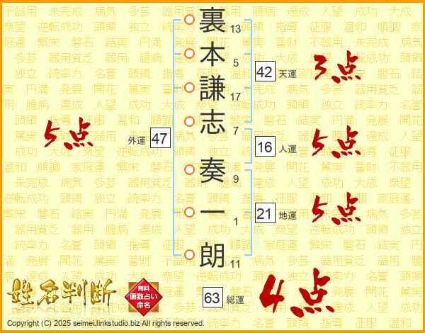 裏(13画)本(5画)謙(17画)志(7画) 奏(9画)一(1画)朗(11画)