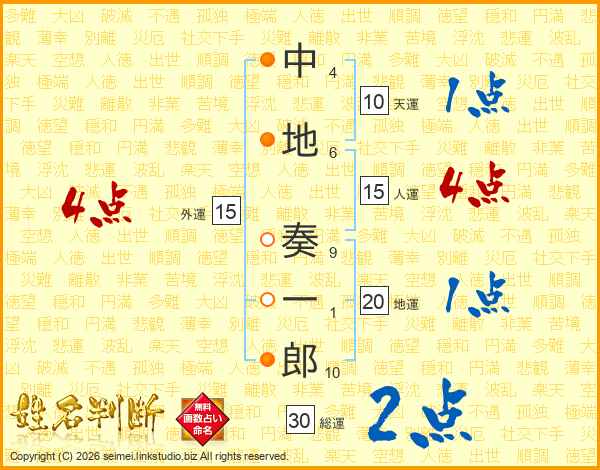 中(4画)地(6画) 奏(9画)一(1画)郎(10画)