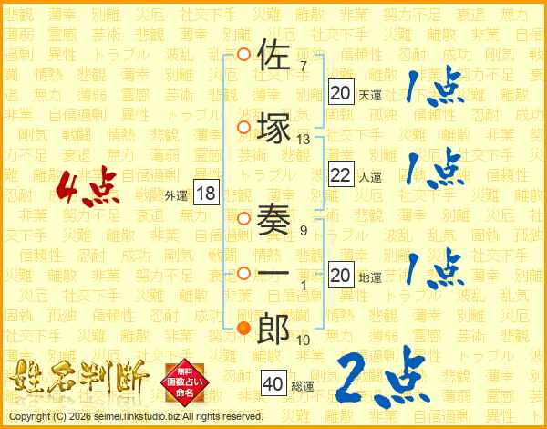 佐(7画)塚(13画) 奏(9画)一(1画)郎(10画)