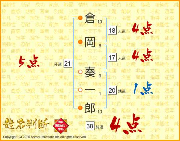 倉(10画)岡(8画) 奏(9画)一(1画)郎(10画)
