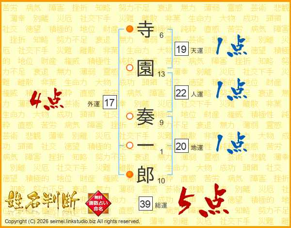 寺園奏一郎さんの総運は39画の5点!