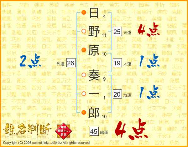 日(4画)野(11画)原(10画) 奏(9画)一(1画)郎(10画)