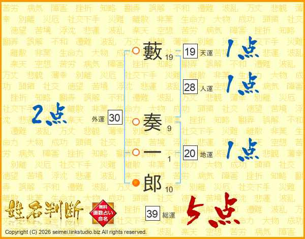 藪奏一郎さんの総運は39画の5点!