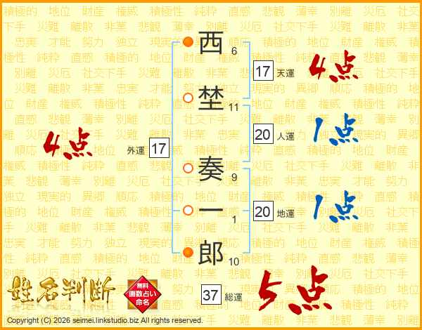 西(6画)埜(11画) 奏(9画)一(1画)郎(10画)