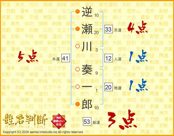 逆(10画)瀬(20画)川(3画) 奏(9画)一(1画)郎(10画)