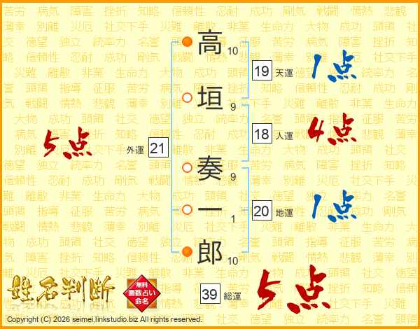 高(10画)垣(9画) 奏(9画)一(1画)郎(10画)