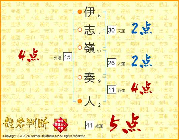 伊(6画)志(7画)嶺(17画) 奏(9画)人(2画)