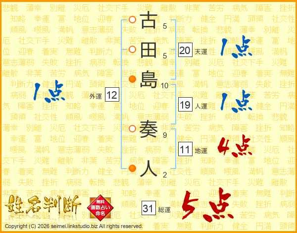 古(5画)田(5画)島(10画) 奏(9画)人(2画)
