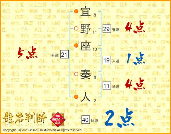 宜(8画)野(11画)座(10画) 奏(9画)人(2画)