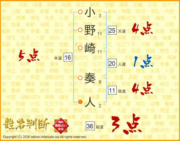 小(3画)野(11画)崎(11画) 奏(9画)人(2画)