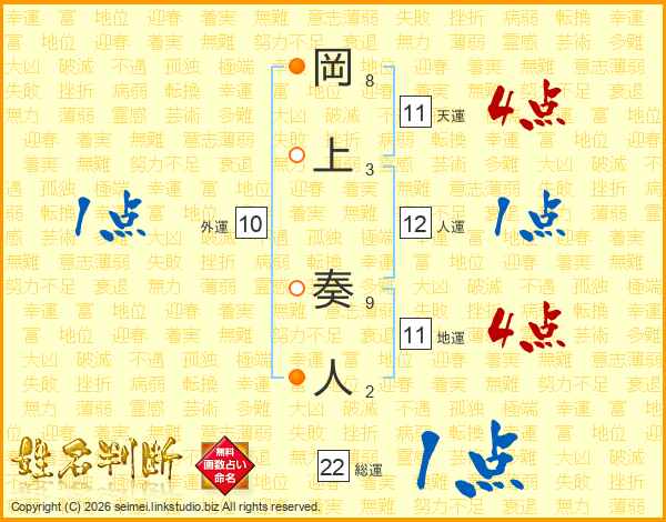 岡上奏人さんの総運は22画の1点!