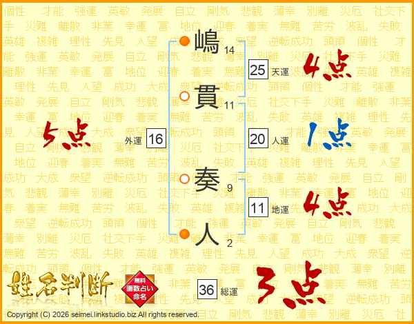 嶋(14画)貫(11画) 奏(9画)人(2画)