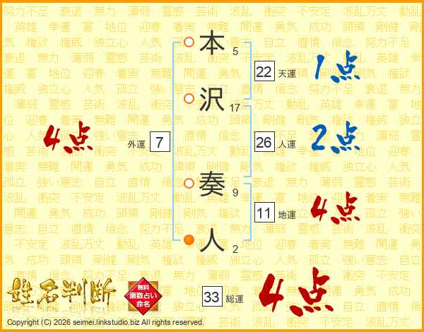 本沢奏人さんの総運は33画の4点!